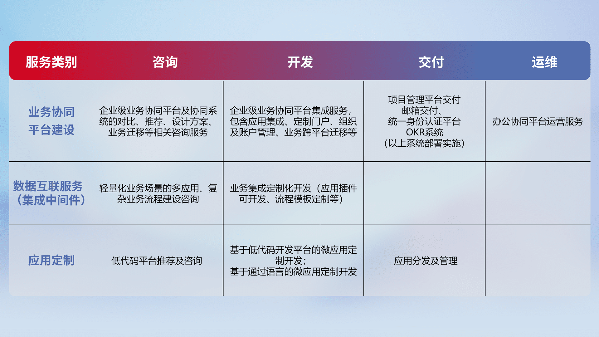 针对钉钉、、企微、、IDaas等平台级产品提供产品的规划、、方案、、交付、、、、定制化开发等服务,,,实现如统一协同办公、、、智能客户服务、、、混合会议管理、、、智能数据查询、、等业务场景,,,,实现数字化转型。。。。